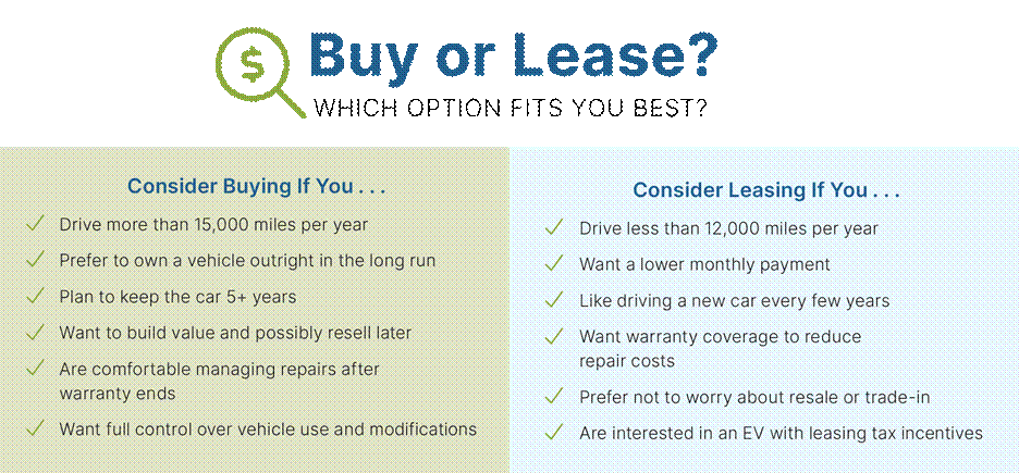 - Electric vehicle (EV) incentives may favor leasing. Certain federal tax credits are currently easier to access through a lease than a purchase, as dealers can apply the credit to reduce lease costs directly.