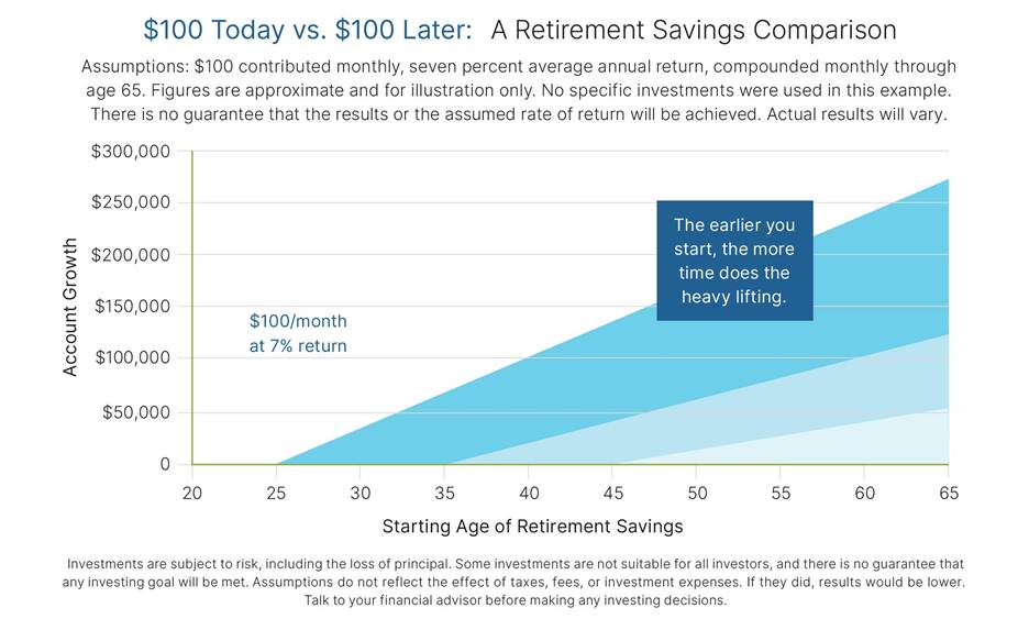 When life is busy, it’s easy to promise yourself you’ll “start saving later.” The catch is that retirement accounts don’t just grow with what you put in—they grow with time. And time is the one ingredient you can’t make up. Starting earlier, even with small amounts, can make reaching your goals easier and less expensive in the long run.